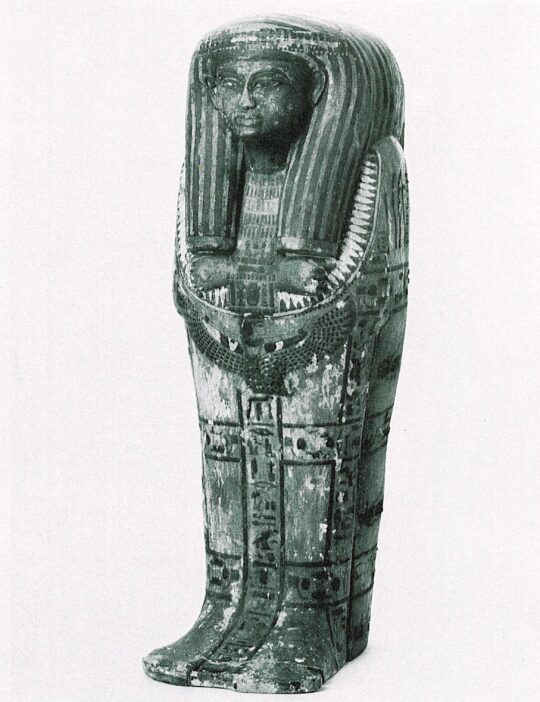 gegangen ist und 1987 bei Sotheby’s in London für kurze Zeit wieder auftauchte, zeigt das Kind mit dreigeteilter Perücke, einem Blütenkragen sowie einer Darstellung der geflügelten Göttin Mut. Mehrere Inschriftenbänder verlaufen horizontal und vertikal über den Sargkörper. An den Seiten werden zwischen den Bändern verschiedene Gottheiten, darunter die vier Horus-Söhne, abgebildet.
